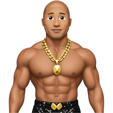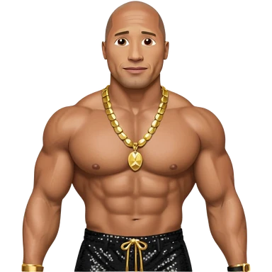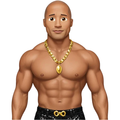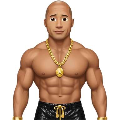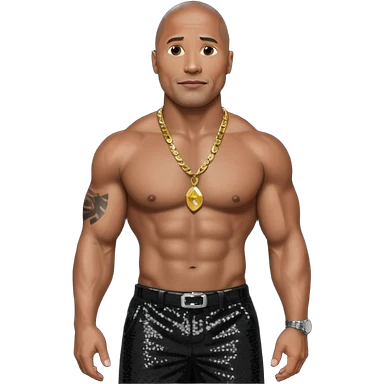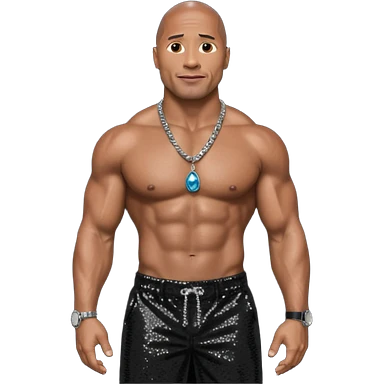 Dwayne Johnson with black sequin baggy pants, shirtless with necklace, dark brown hair emoji