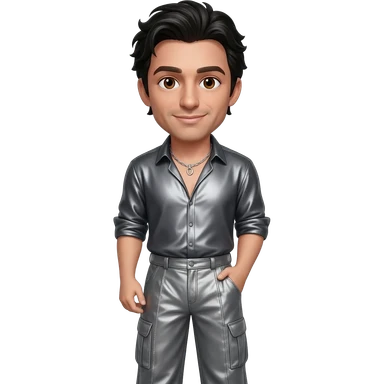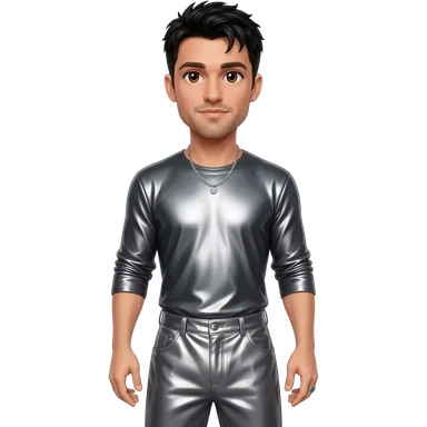 Chris Kirkpatrick from NSYNC with brown eyes, black hair, charcoal metallic shirt, warm gray metallic long baggy pants, silver necklace emoji