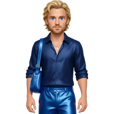 Chris Evans with blue eyes, long blonde hair, navy blue metallic shirt, cobalt blue metallic baggy pants, silver necklace emoji