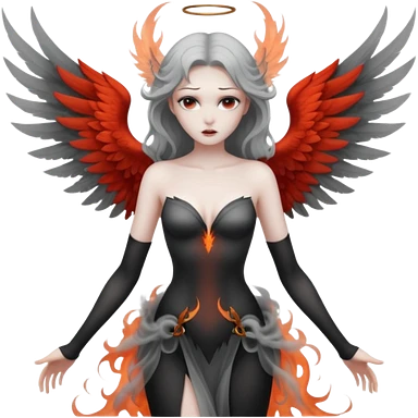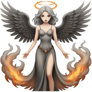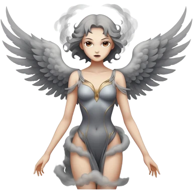 Winged woman standing motionless in smoke, restrained lust, infernal elegance emoji