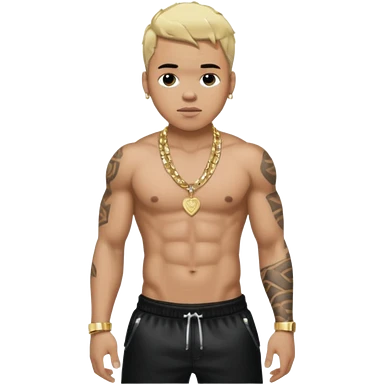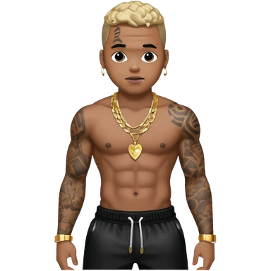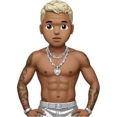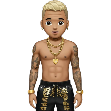 Chris Brown with metallic black pants, shirtless with necklace emoji