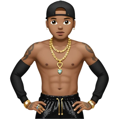 Chris Brown with black sequin baggy pants, shirtless with necklace emoji