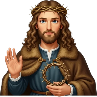 cinematic - en face penetrating balanced Albrecht Dürer Renaissance self-portrait with long curly hair in a cloak with a fur collar, in Renaissance dress, holding a crown of thorns with his left hand - contemporary representations of Christ emoji