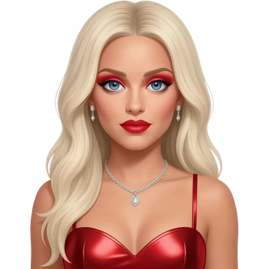 Christina Aguilera with blue eyes, long blonde hair, red eyeshadow and lipstick, red metallic sweetheart dress, silver necklace and earrings emoji | AI Emoji Generator