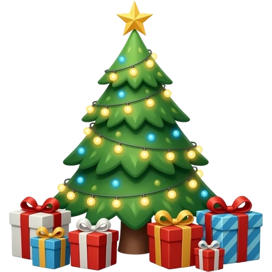 Christmas tree with glowing lights and gifts around emoji