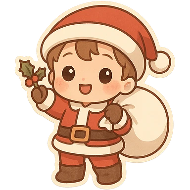 Add Christmas-themed outfit to the chibi character: a red hat with white stripe, red sweater with snowflakes, green pants or skirt, and festive accessories, maintaining the chibi style and transparent background. emoji