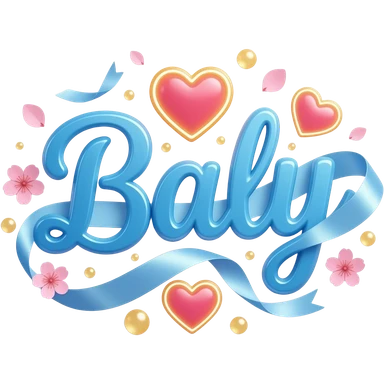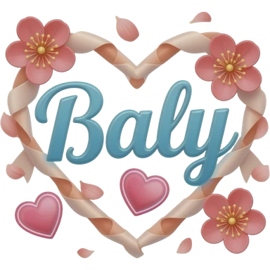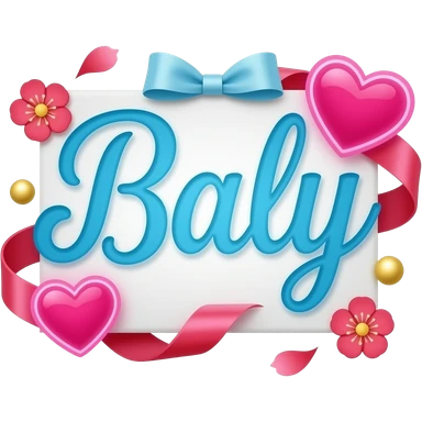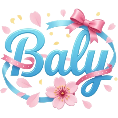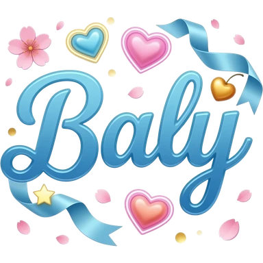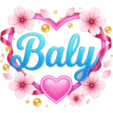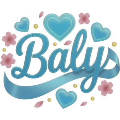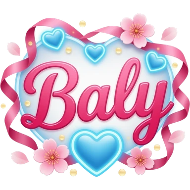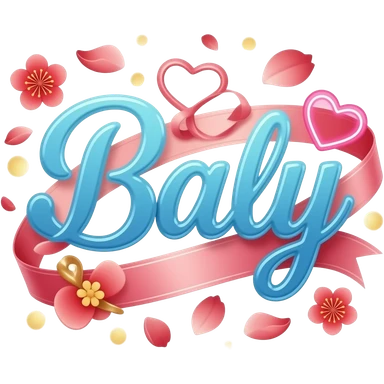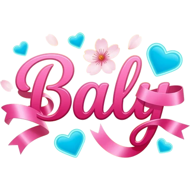 A sleek, sky blue text 'Baly' decorative symbols, adorned with satin ribbons and glowing neon-colorful hearts. Surrounded by floating cherry blossom petals and golden bokeh. Vibrant, modern, and feminine with a cinematic glow emoji