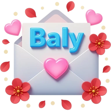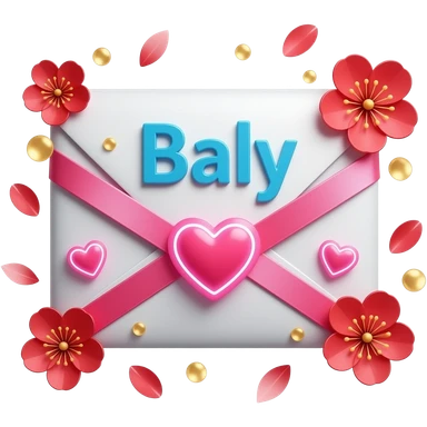 A sleek, sky blue text 'Baly' decorative mail, adorned with satin ribbons and glowing neon-pink hearts. Surrounded by floating red blossom petals and golden bokeh. Vibrant, modern, and feminine with a cinematic glow emoji