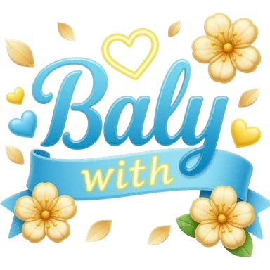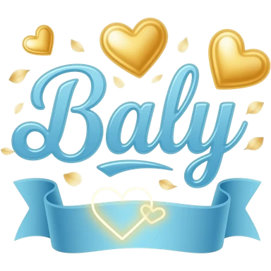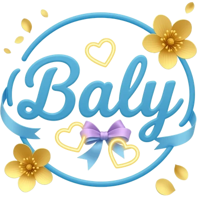 A sleek, sky blue text 'Baly' decorative symbols, adorned with satin ribbons and glowing neon-colorful hearts. Surrounded by floating golden blossom petals and golden bokeh. Vibrant, modern, and feminine with a cinematic glow emoji