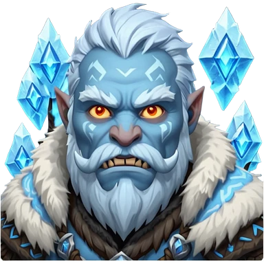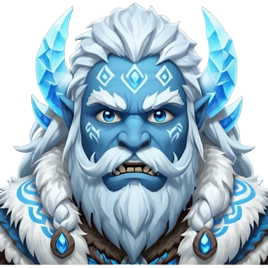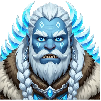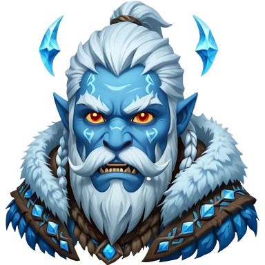 Legendary fantasy orc Christmas portrait icon, Frostfather and Snow Maiden inspired, primal winter god style, massive icy beard, glowing blue eyes, heavy fur coat, tribal frost runes, powerful brutal presence, blizzard atmosphere, clean stylized emoji icon emoji