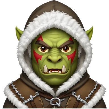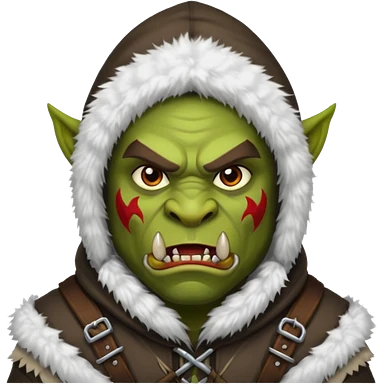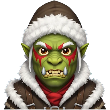 Fantasy Christmas orc raider icon, winter bandit style, fur hood, aggressive cunning expression, snowy action mood, clean emoji portrait style, male/female variant emoji