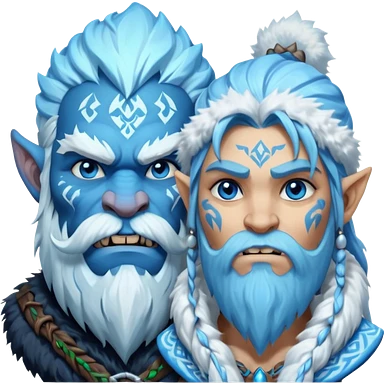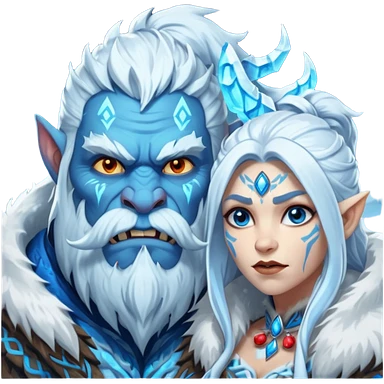 Legendary fantasy orc Christmas portrait icon, Frostfather and Snow Maiden inspired, primal winter god style, massive icy beard, glowing blue eyes, heavy fur coat, tribal frost runes, powerful brutal presence, blizzard atmosphere, clean stylized emoji icon, male/female variant emoji