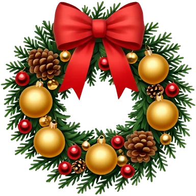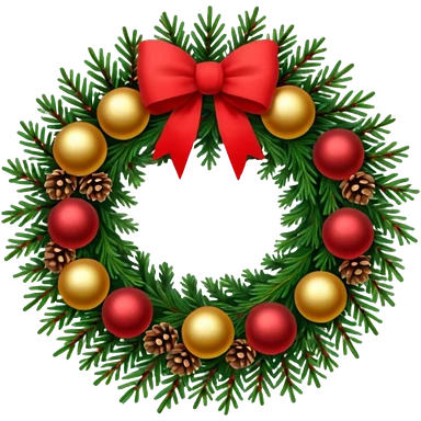 A Christmas wreath made entirely of fir trees, decorated with a single red bow at the bottom, pine cones, and Christmas tree balls. emoji