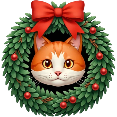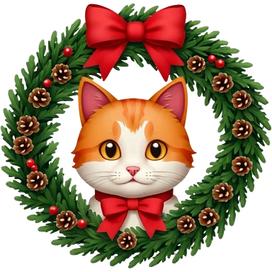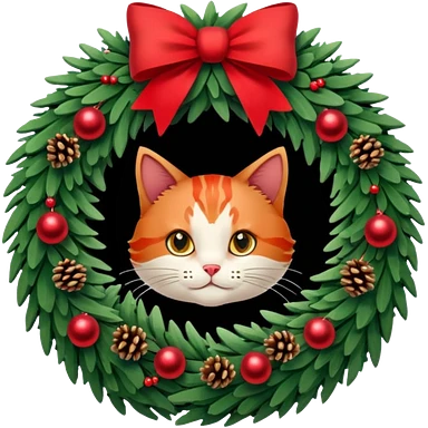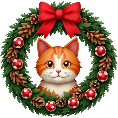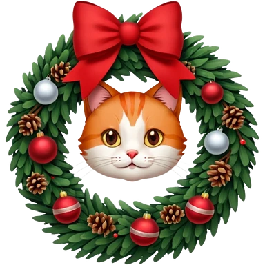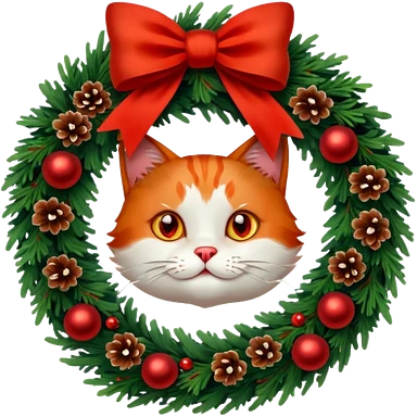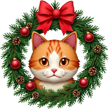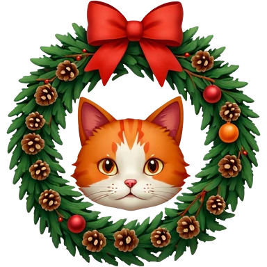 A Christmas wreath made entirely of fir trees, decorated with a red bow at the bottom, pine cones and Christmas tree balls, and a cat poking its face through the hole in the center. emoji