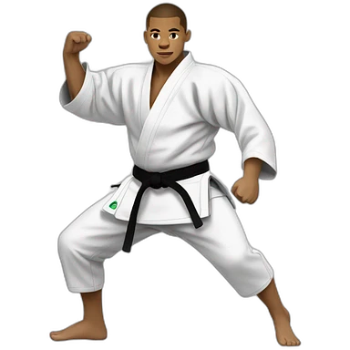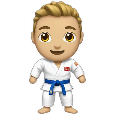 female judo athlete all blue robe with black belt, serious face, hair in a bun. Plus sided, full body emoji