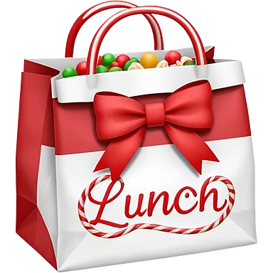 christmas paper lunch bag with the word lunch on it and a bow and candycanes emoji