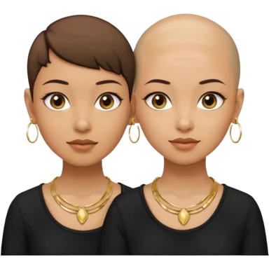 Twin sisters olive skin tone one with bald head and one with pixie brown hair cut wearing gold hoop earrings and gold necklace and black shirts emoji