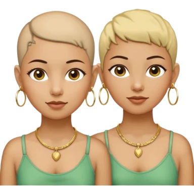 Twin sisters olive skin tone one with bald hair and one with pixie cut wearing gold hoop earrings and gold necklace emoji