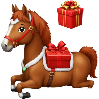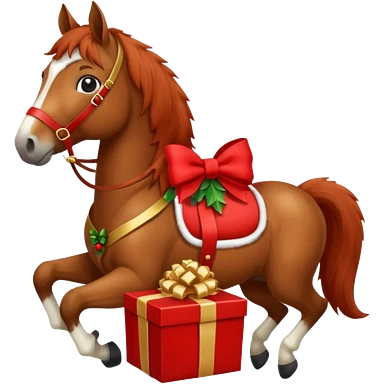 a christmas horse with a red saddle, which has a red gift box with a white bow on the saddle emoji