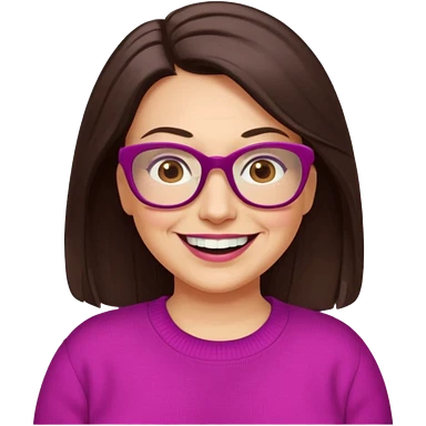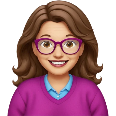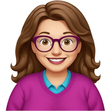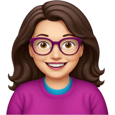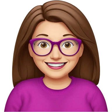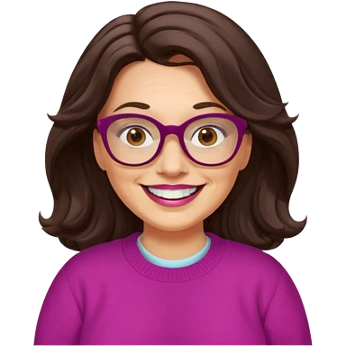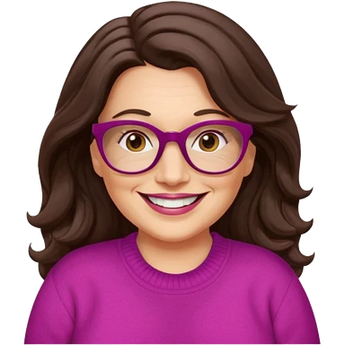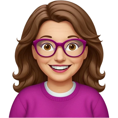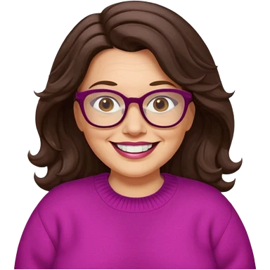 50 yr Caucasian woman, long brown hair parted on side, brown eyes, glasses, big smile, white teeth, fuscia sweater, chubby, wavy hair emoji