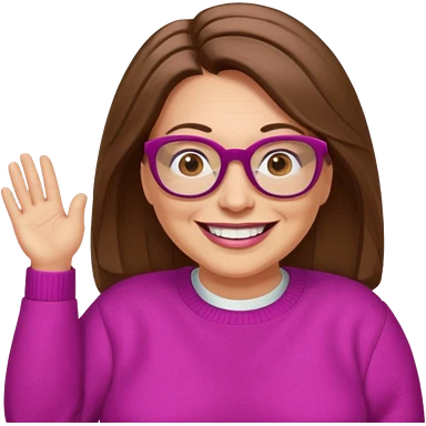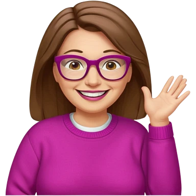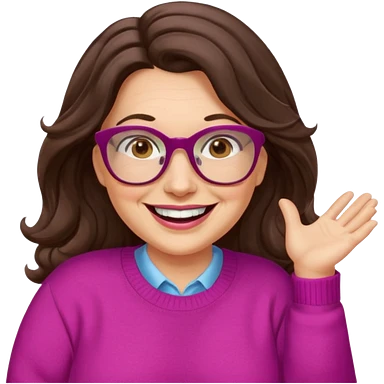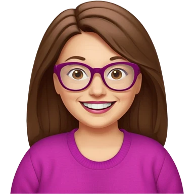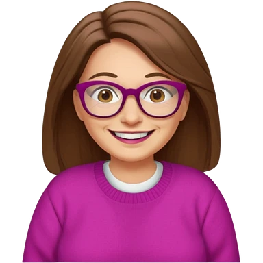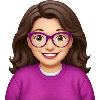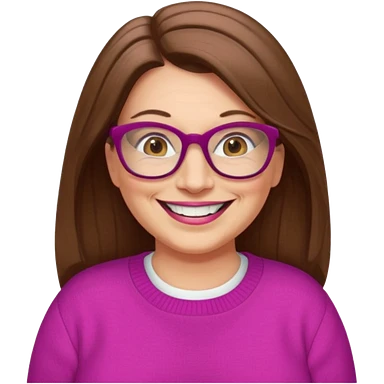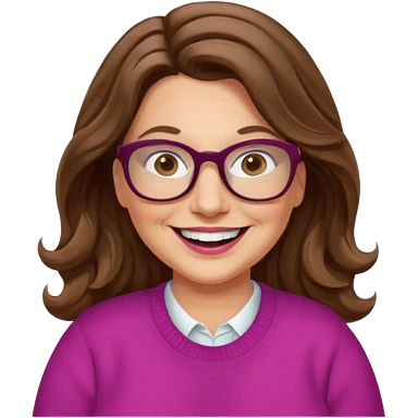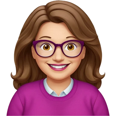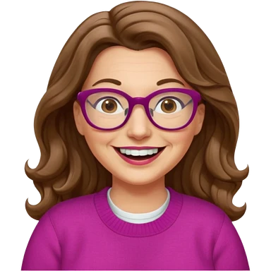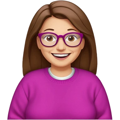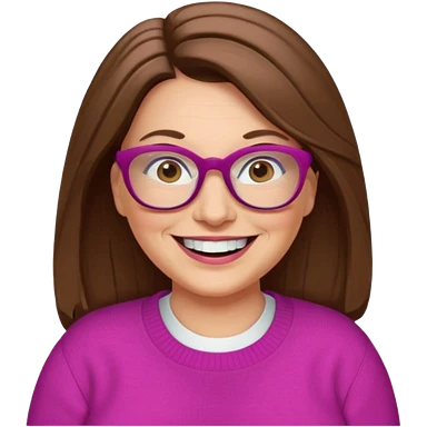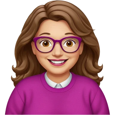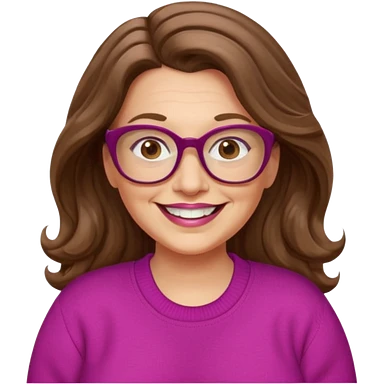50 yr Caucasian woman, long brown hair parted on side, brown eyes, brown glasses, big smile, white teeth, fuscia sweater, chubby, wavy hair emoji