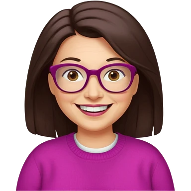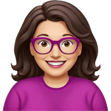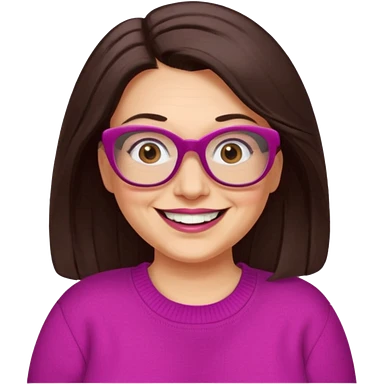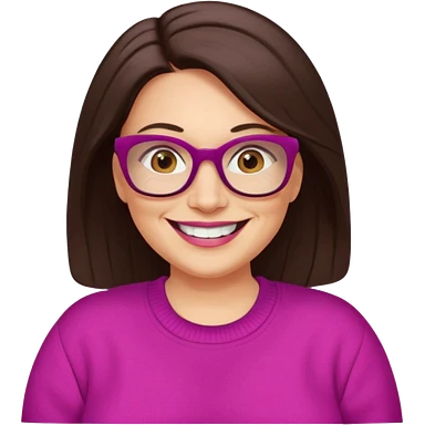 50 yr Caucasian woman, long dark brown hair parted on side, brown eyes, brown glasses, big smile, white teeth, fuscia sweater, chubby, wavy hair emoji
