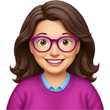 50 yr Caucasian woman, long brown hair parted on side, brown eyes, glasses, big smile, white teeth, fuscia sweater, chubby emoji