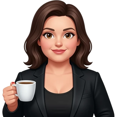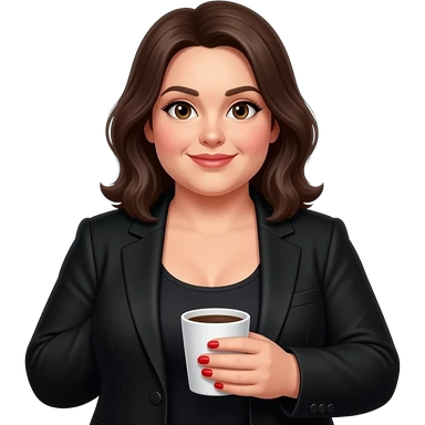 chubby white woman with dark brown shoulder length hair and brown eyesin a black suit and tank top with red fingernails holding a cup of coffee emoji