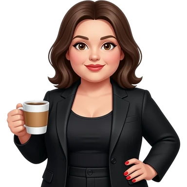 chubby white woman in a black suit with red fingernails holding a cup of coffee emoji | AI Emoji Generator