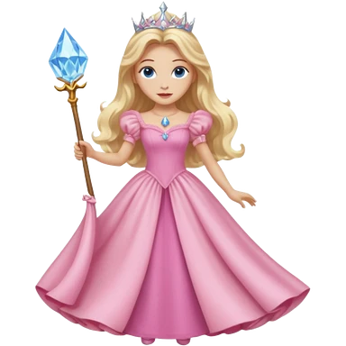 glinda the good witch from wicked movie, blonde hair, beautiful, big silver thin tiara, wand, pink gown emoji