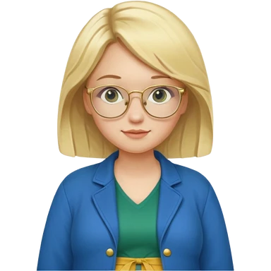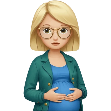 pregnant blonde 18-year old with golden glasses in a bright blue dress and a dark green jacket on top of the blue dress emoji