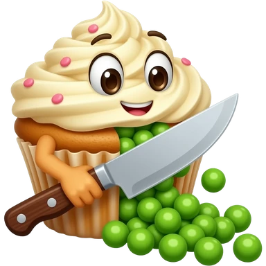 a personified cupcake that cuts itself with a knife and there are peas spilling out of it emoji