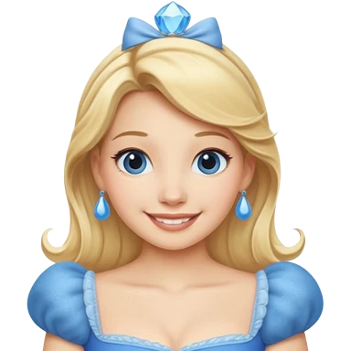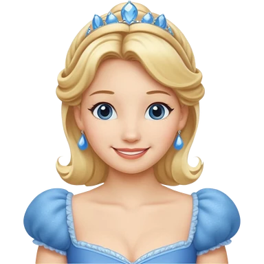 "Cinematic Adorable Elegant Cinderella Portrait Emoji, Head tilted gracefully with sparkling blue eyes, delicate fair skin, and elegantly styled golden-blonde hair in a soft updo, wearing her signature shimmering blue ball gown (chest and above). Simplified yet regal features, highly detailed, glowing with a soft, enchanting radiance, high shine, serene and graceful, stylized with a touch of fairy-tale elegance, bright and endearing, soft glowing outline, capturing the essence of a timeless princess, so magical it feels like she could waltz into a dream!" emoji