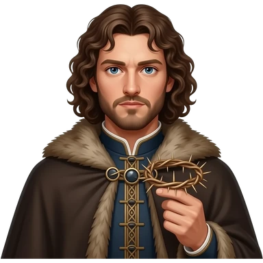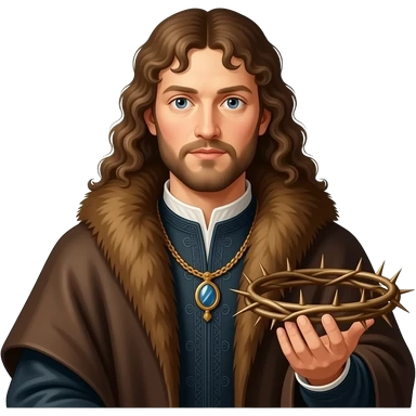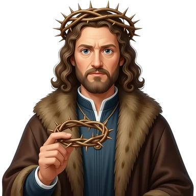cinematic - en face penetrating balanced Albrecht Dürer Renaissance self-portrait with long curly hair in a cloak with a fur collar, in Renaissance dress, holding a crown of thorns with his left hand - contemporary representations of Christ emoji