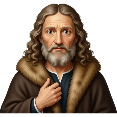 realistic - en face dried up and wrinkled old Albrecht Dürer Renaissance self-portrait with long curly hair in a cloak with a fur collar, in Renaissance dress, holding the fur collar with his left hand - an icon of Christ Himself emoji