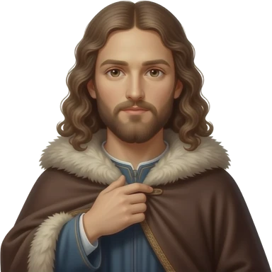 cinematic - en face penetrating balanced, Albrecht Dürer Renaissance self-portrait with long curly hair in a cloak with a fur collar, in Renaissance dress, holding the fur collar with his left hand - contemporary representations of Christ emoji