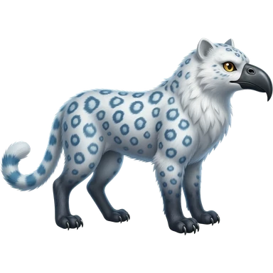 Beaked beaky beak-mouthed Realistic wild natural elegant pretty beautiful handsome shiny colorful furry 4-legged digitigrade snow-leopard-snowy-owl-arctic-fox-gryphon-griffin-fusion-hybrid-fursona-furry-animal-creature, full body, hyper-realism, long tufted tail emoji