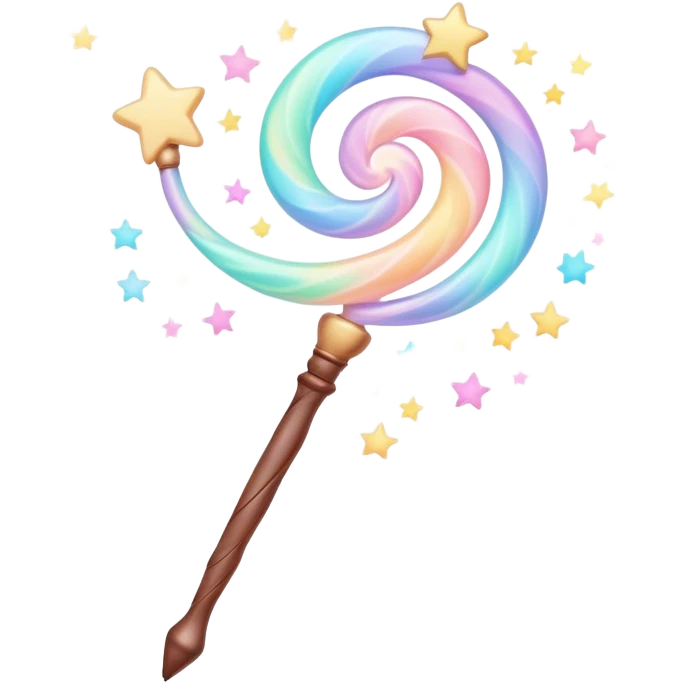 Cinematic cute magical wand, pastel swirls of color, tiny twinkling stars floating around, glowing softly, chubby rounded edges, whimsical and dreamy. emoji