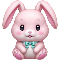 Cinematic adorable pastel pink bunny, chubby cheeks, tiny paws, sparkling round eyes, soft fur with a gentle glow, slightly tilted head, wearing a tiny bow, irresistibly cute and heartwarming. emoji