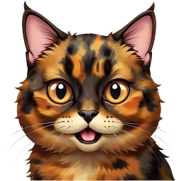 Cinematic Cute Tortoiseshell Cat Portrait Emoji, Head cocked sweetly with bright, curious eyes and a cuddly, mottled fur of rich browns and blacks, simplified yet charmingly adorable, highly detailed, glowing with a warm, gentle radiance, high shine, playful and endearing, styled with a dash of whimsical feline magic, soft glowing outline, capturing the essence of a cute tortoiseshell cat that seems ready to pounce with affectionate mischief! emoji | AI Emoji Generator