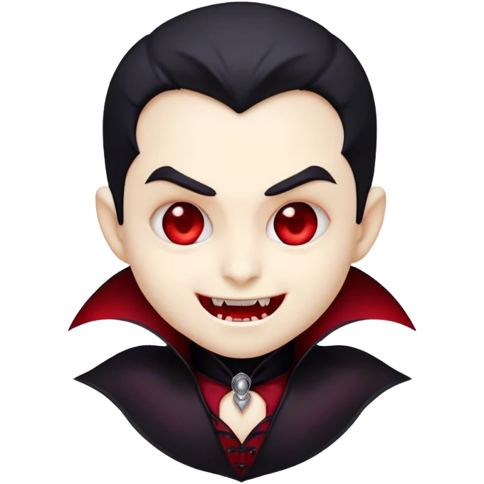 Cinematic Cute Vampire Portrait Emoji, with a refined yet playful small, rounded pale face accented by tiny, cute fangs and bright, twinkling eyes, sporting miniature elegant dark attire with a hint of crimson, simplified yet irresistibly charming, highly detailed with a soft glowing outline that captures the delightful duality of spooky sweetness and stylish allure!emoji