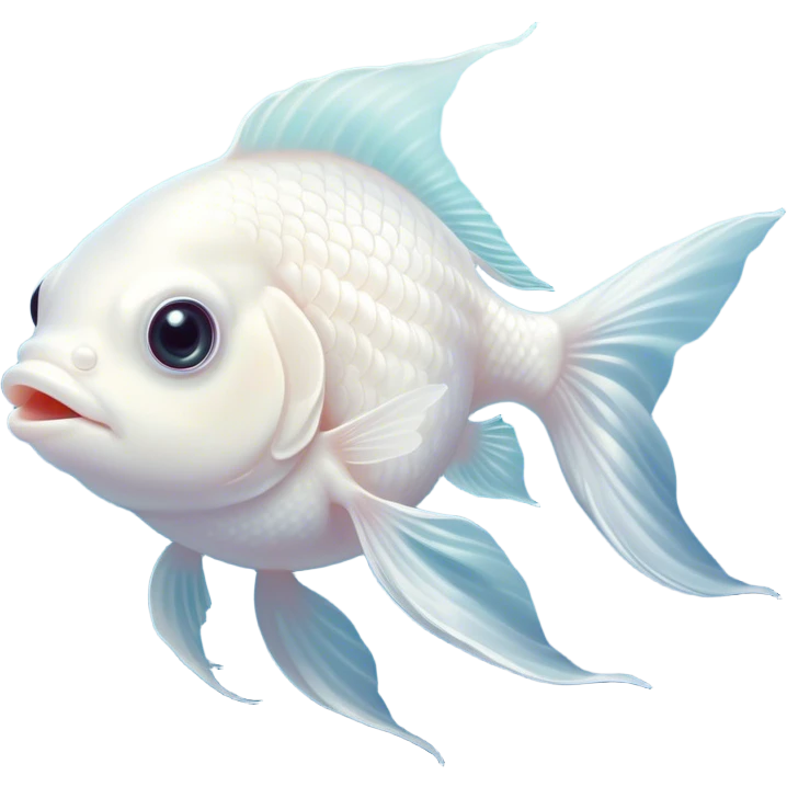 Cinematic Cute White Goldfish Portrait Emoji, Head tilted playfully and inquisitively, featuring a glossy, pure white body with delicate, shimmering scales and round, sparkling pale eyes filled with curiosity, Simplified yet irresistibly adorable features, highly detailed, glowing with a warm, friendly glow, high shine, affectionate and lively, stylized with a touch of whimsy, bright and endearing, soft glowing outline, capturing the essence of a mischievous yet loving goldfish, so playful it feels like it could swim out of the screen and into your heart!emoji
