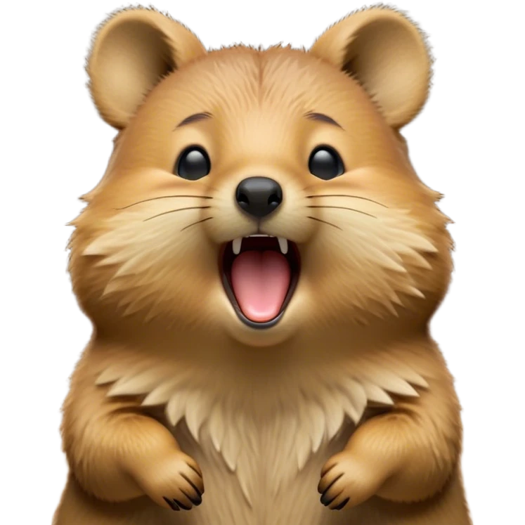 Cinematic Cute Yawning Quokka Portrait Emoji, Head tilted slightly with a dramatic, wide-open yawn, showcasing a soft, downy brown fur with a slightly droopy expression and eyes barely open in drowsy contentment, Simplified yet irresistibly adorable features, highly detailed, glowing with a soft, cozy glow, high shine, relaxed yet expressive, stylized with a touch of playful charm, bright and endearing, soft glowing outline, capturing the essence of a sleepy yet affectionate quokka, so drowsy it feels like it could stretch out of the screen and curl up for a nap!emoji