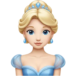 Cinematic Elegant Cinderella Portrait Emoji, rendered in a cinematic, vector-style with minimal shading and bold, simplified shapes. Depict Cinderella in her classic ball gown (chest and above) with fair, porcelain skin and elegantly styled blonde hair, her eyes soft and kind, and her expression serene and graceful. The design glows with a gentle, enchanting radiance and high shine, capturing the timeless beauty of a fairy tale princess.emoji