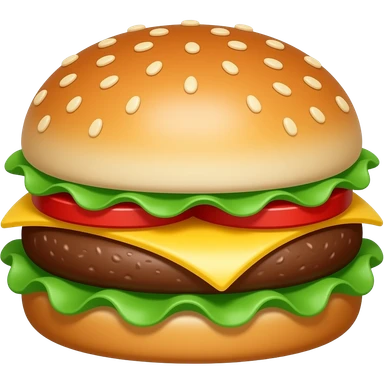 Cinematic juicy cheeseburger, perfectly grilled patty, melted cheese, crisp lettuce, tomatoes, and pickles, soft sesame seed bun, glossy and rich, warm glowing background, ultra-detailed and appetizing. emoji | AI Emoji Generator