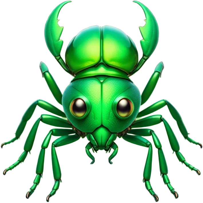 Cinematic Noble Green Bugdie Portrait Emoji, Poised and regal, with a tiny, delicate build and a vibrant, well-detailed emerald exoskeleton, deep-set soulful multifaceted eyes, Simplified yet sharp and sophisticated features, highly detailed, glowing with a soft, dignified glow, high shine, intelligent and alert, stylized with an air of miniature majesty, focused and attentive, soft glowing outline, capturing the essence of a watchful and confident insect, so majestic it feels as though it could scuttle out of the screen with effortless authority!emoji