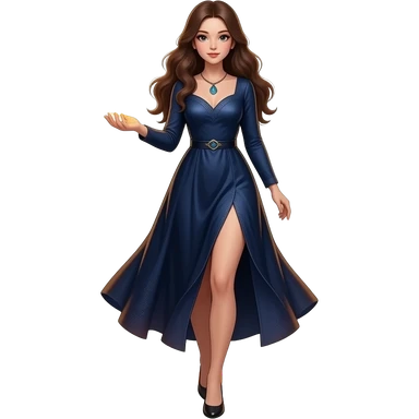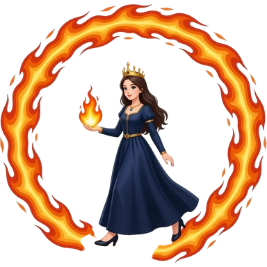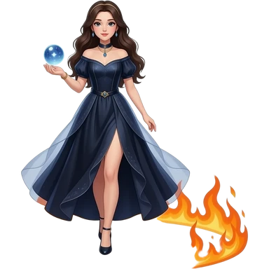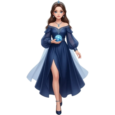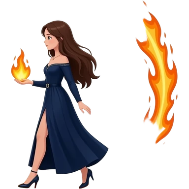cinematic realistic - an elegant mystical girl in a long dark blue dress carries a small flashing globe in her hand and walks through a flaming ring emoji | AI Emoji Generator