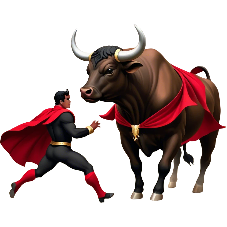 Cinematic Realistic black charging bull, against a matador depicted in a flowing red cape, captured in the dramatic moment of confronting a charging bull in a traditional bullring, rendered with dynamic motion and dramatic lighting that encapsulates the intensity and artistry of the spectacle,emoji