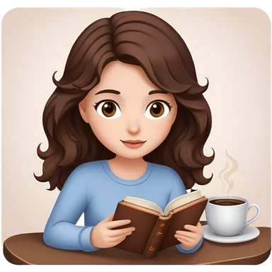 girl with wavy choco brown hair, brown eyes, and some blush is reading a book and has a cup of coffee next to her. emoji