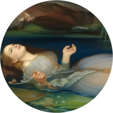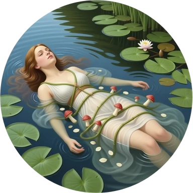ghost of Ophelia lies in the water wrapped in toadstool and water lily - a scene from the original painting by John Everett Miles emoji